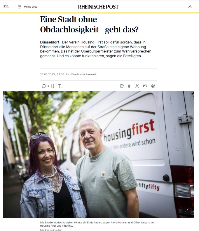 Housing First beendet Wohnungslosigkeit unmittelbar und bietet flexible wohnbegleitende Hilfen zum dauerhaften Wohnungserhalt an. Der neu gegründete und von der Stadt geförderte Housing First Düsseldorf e. V. setzt mit Synergien aus Wirtschaft, Wissenschaft, Sozialarbeit und privatem Engagement an, Obdachlose in Wohnungen zu bringen.