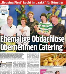 Von der Wohnung aus den Schritt auf den Arbeitsmarkt machen – das ist das Konzept von unserem Arbeitswelten-Kennenlernen Projekt. Housing First Nutzer*innen hospitieren in verschiedenen Arbeitsgebieten. Dafür braucht es auch immer die passenden Arbeitgeber*innen; beim ZAKK standen die Türen weit offen: Hier durften wird das Künstler*innen Catering tatkräftig unterstützen.