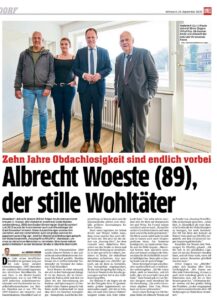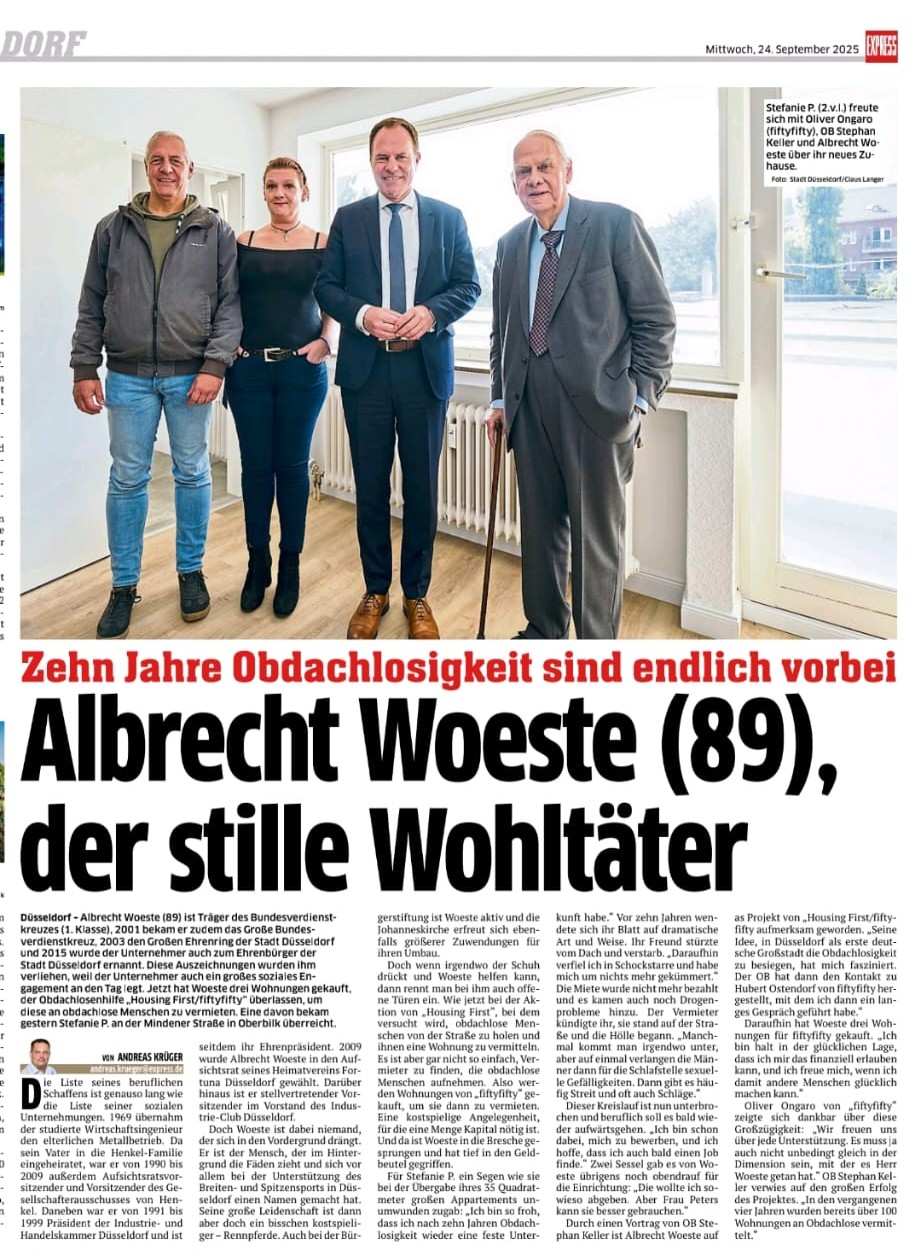 Unternehmer und Ehrenbürger der Stadt Düsseldorf Albrecht Woeste ist es zu verdanken, dass Stefanie P. demnächst fast 10 Jahre Wohnungslosigkeit hinter sich lassen kann. Hier die Artikel lesen.