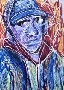 Bei Ralf jedenfalls ist das so. Er zeigt ein naturgetreu gemaltes Portrait seiner letzten großen Liebe, die schon vor 11 Jahren wegen seines und ihres Drogenkonsums in die Brüche gegangen ist. Auch die unzähligen anderen Frauenbildnisse, schnell hingezeichnete Skizzen, erzählen von der Einsamkeit und vielleicht auch von dem Wusch, wieder eine Partnerin zu finden. Der 61jährige Akademie-Student, der in unzähligen Knast-Aufenthalten wegen des Gebrauchs illegalisierter Substanzen und Fahrens ohne Ticket sein Talent für die Malerei perfektioniert hat, beschäftigt sich künstlerisch aber nicht nur mit Motiven von Frauen. Die Aufgabe, ein Bildnis aus dem eigenen Leben zu schaffen, löste er, der sonst sehr naturgetreu, wenn auch zumeist der Phantasie entspringend, unterwegs ist, eher abstrakt. In Erinnerung seines langen Kokain-Konsums malte er mit pastösem Farbauftrag auf eine Leinwand einige weiße Linien und dazu klebte er Alufolie, in die der rauschauslösende Stoff üblicherweise auf dem Schwarzmarkt verpackt ist. Ein ganz anderes Kunstwerk wiederum ist sein kleiner Garten, den er auf einem freien Stück Erde neben dem Gehweg an seinem Platz, an dem er die fiftyfifty verkauft, geschaffen hat. Gartenkunst ist nicht erst seit den Palmen auf Verkehrsinseln von Tita Giese en vogue; Ralf kennt sich aus. Und seine Kund*innen bewundern die kleine Pflanzen-Oase, die er von Meisterhand angelegt hat. „Kunst ist Leben“, so Ralf, und: „Bilder sind meine Seele.“